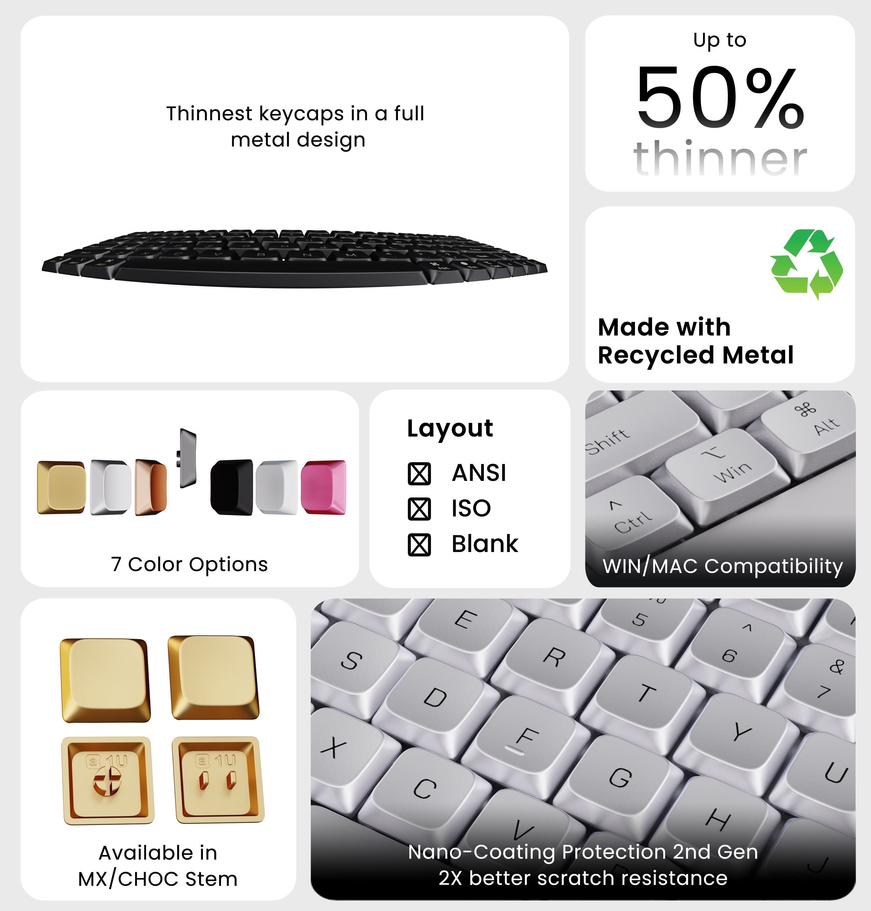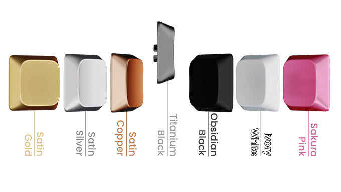 Personalize your Awekeys Air setup with seven elegant colors of metal. Satin Gold, Satin Silver, Satin Copper, Titanium Black, Obsidian Black (Matte), Sakura Pink (Matte) and Ivory White (Matte).